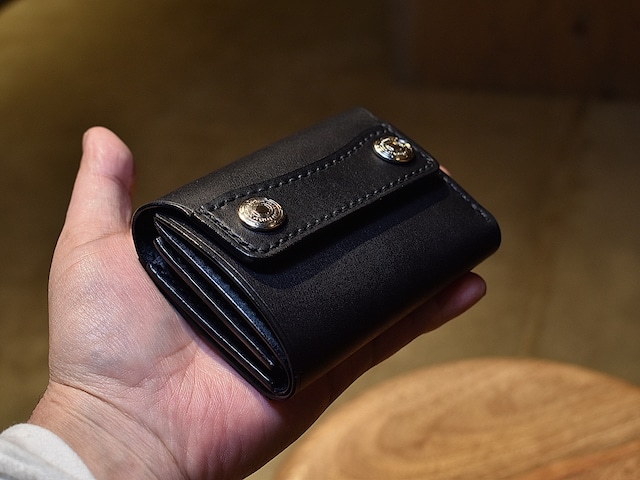※この製品は受注生産になります。(納期約1ヶ月) TRACKER MINI MINI WALLET BLACK トラッカーミニミニウォレット ブラック W105×H80×D20mm ¥25,850(税込) 素材/牛革ヌメ 色/ブラック ステッチ/ブラック(手縫) ボタン色/ブラス(金色)、ブラスニッケル(銀色)よりお選びいただけます。 ウォレットコード用リング(ハトメリング)は+550円で取り付けることができます。