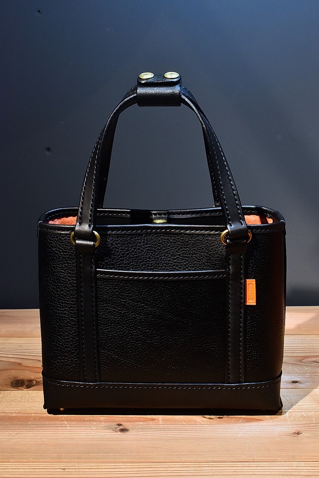 Leather tote bag M Black レザートートバッグ M ブラック 内張りにスエード(薄オレンジ)貼りカスタム。 W260×H210×D115mm ¥55,000(本体価格¥50,000) 内張りスエードカスタム ¥6,600