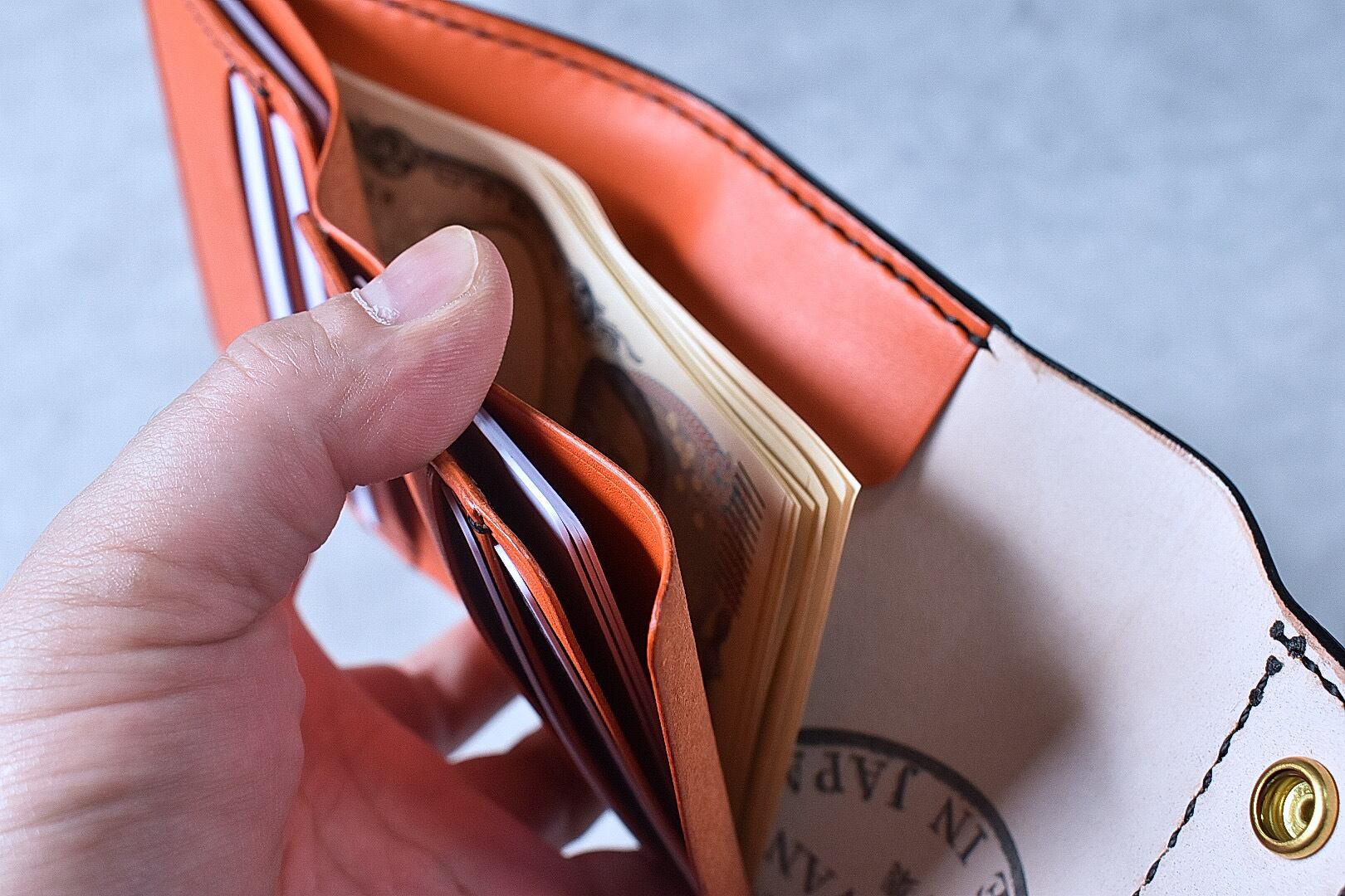 このコンパクトウォレットは、毎日の使い勝手を追求して作られました。小さいながらもたくさんの収納スペースを確保し、使い勝手にこだわったデザイン、お札の角が曲がりにくいように設計されています。
