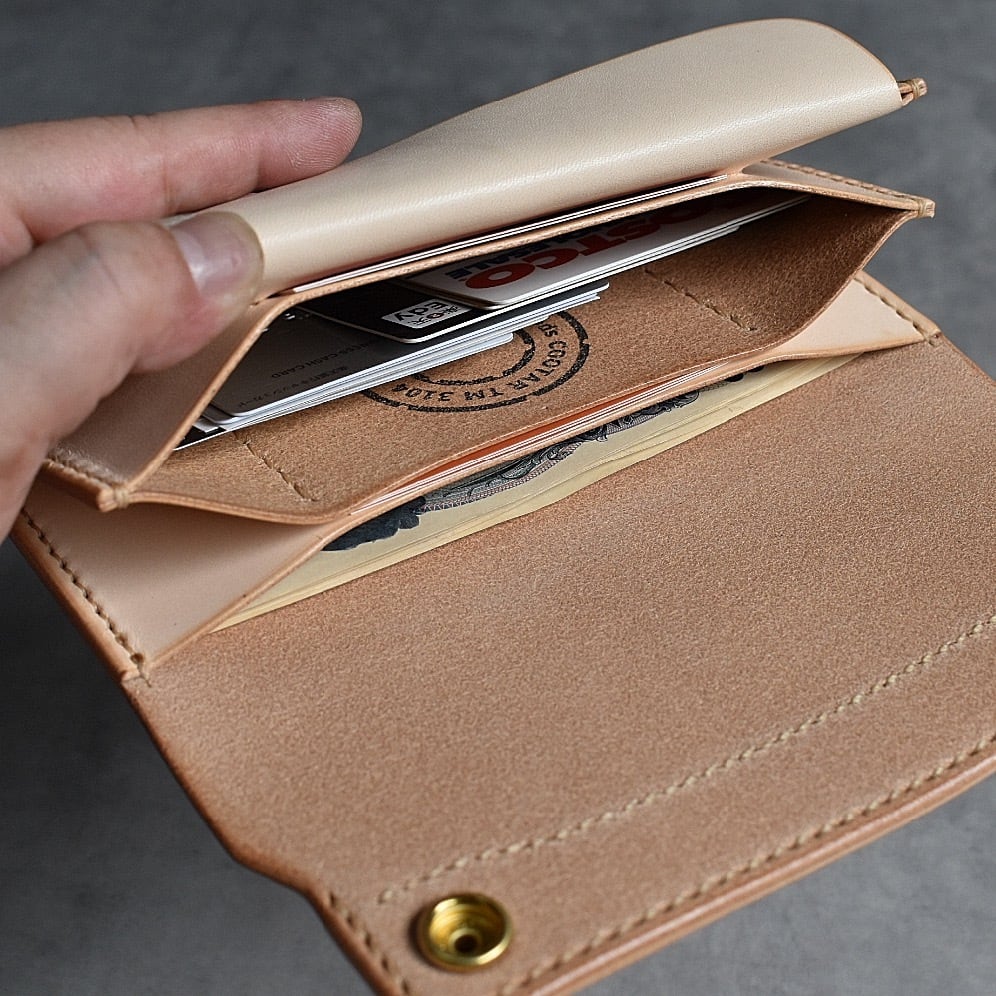 トラッカーウォレットの中では最大サイズのロングタイプ。この長財布は、札を折らずにスッキリ収納できるのが特徴です。トラッカーウォレットらしくシンプルなデザインでカードや小銭もたっぷり収納可能。製品は高品質な牛革を使用し、すべて手縫いにて丁寧に作られています。頑丈なので長くお使いいただけます。