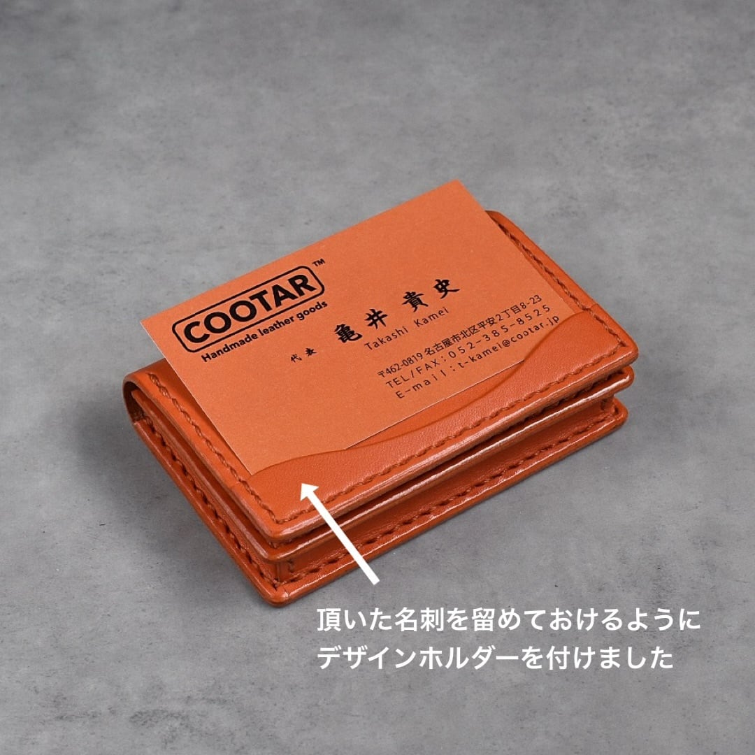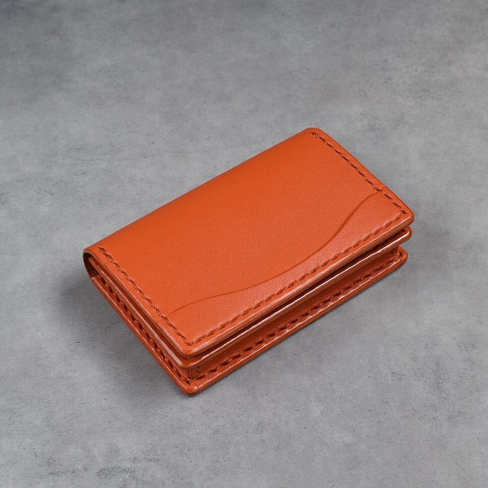 すべて手縫いで丁寧に作られた名刺入れ、Business card holder (orange)。自然な風合いと経年変化が魅力的なアイテムです。ビジネスシーンでも使いやすいデザインとなっています。手に馴染む使い心地と、長くお使いいただける耐久性も魅力のひとつ。あなたのビジネススタイルをさらに引き立てる名刺入れです。